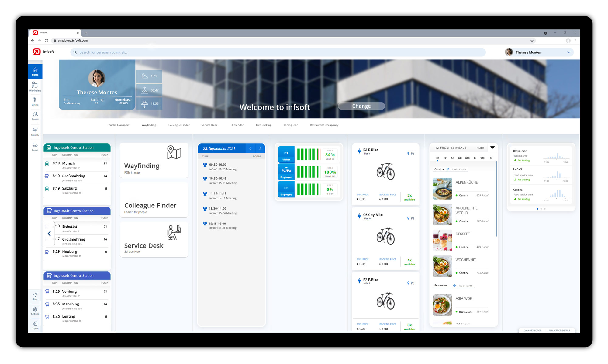Maintaining and improving the employee experience (EX) is a major concern for many companies. In the age of New Work, enterprises turn to digital solutions for help. Providing staff with a strong user experience in the workplace can increase the overall business value in the long run. Our product infsoft Workplace Experience follows a holistic approach, where both the workforce and the company benefit from being connected to the office environment. The solution is available not only as a mobile application but also as a progressive web app (PWA). As such, it is accessible via a web browser on any device and from any location. The progressive web app includes all the functionalities of the native app except for real-time localization.