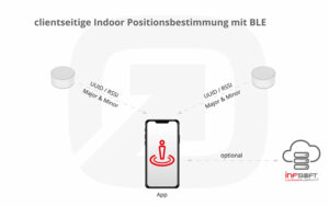 Für die Positionsbestimmung in clientseitigen Anwendungen werden mehrere Beacons benötigt. Sie können ohne großen Aufwand an Decken oder Wände geklebt oder geschraubt werden und lassen sich gut in jede Umgebung integrieren. Die Beacons senden eindeutige Signale aus, aus denen die Smartphone-App mittels Fingerprinting den Standort berechnet. Mithilfe von Turn-by-Turn Richtungsanweisungen wird der Nutzer durch das Gebäude geleitet, während dabei automatisch seine Position bestimmt wird. Eine Beacon-Infrastruktur ermöglicht es auch, Aktionen auszulösen, beispielsweise die Anzeige von Angeboten oder Informationen auf dem Smartphone.