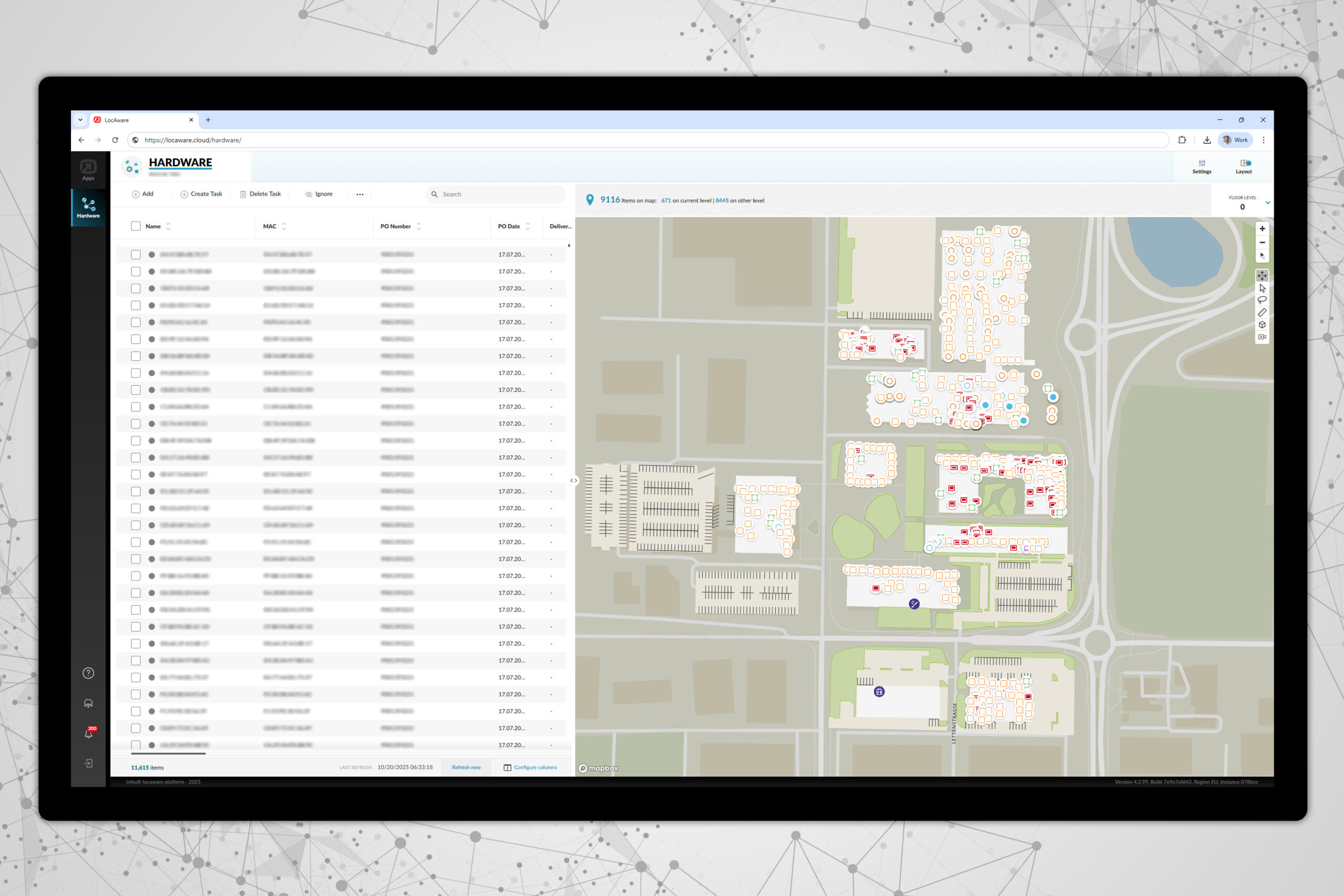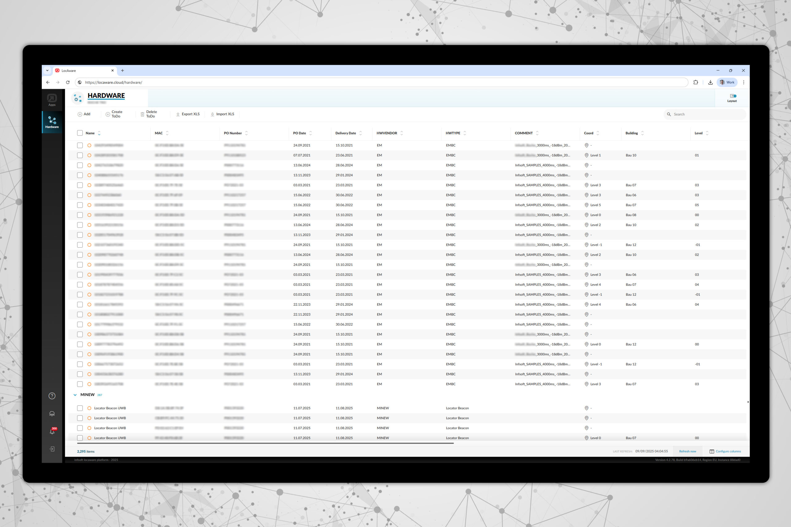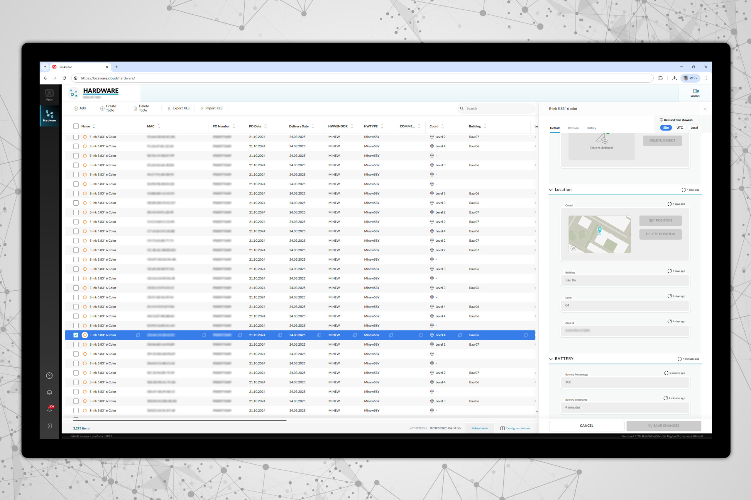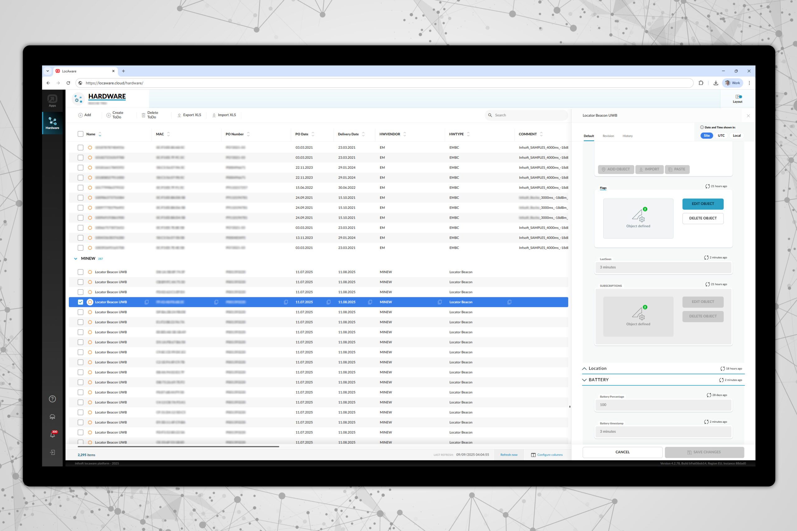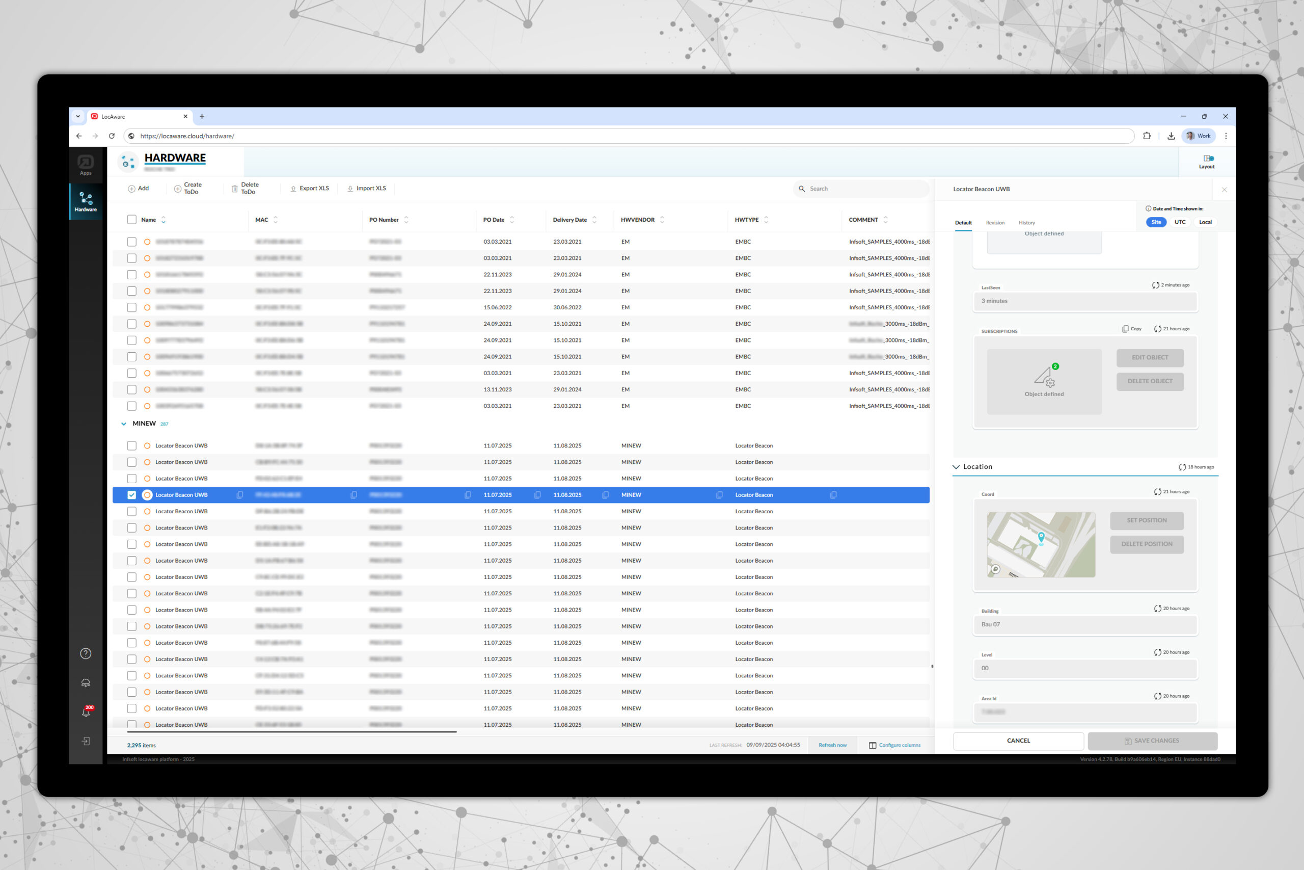 Das Tool infsoft Hardware bietet eine vollständige, strukturierte Übersicht über sämtliche Hardwarekomponenten, die von infsoft an den Kunden ausgeliefert wurden. Es dient als zentrales Inventar- und Monitoring-Werkzeug und sorgt durch systemweite Synchronisation für konsistente Informationen in allen angebundenen Tools der Plattform.