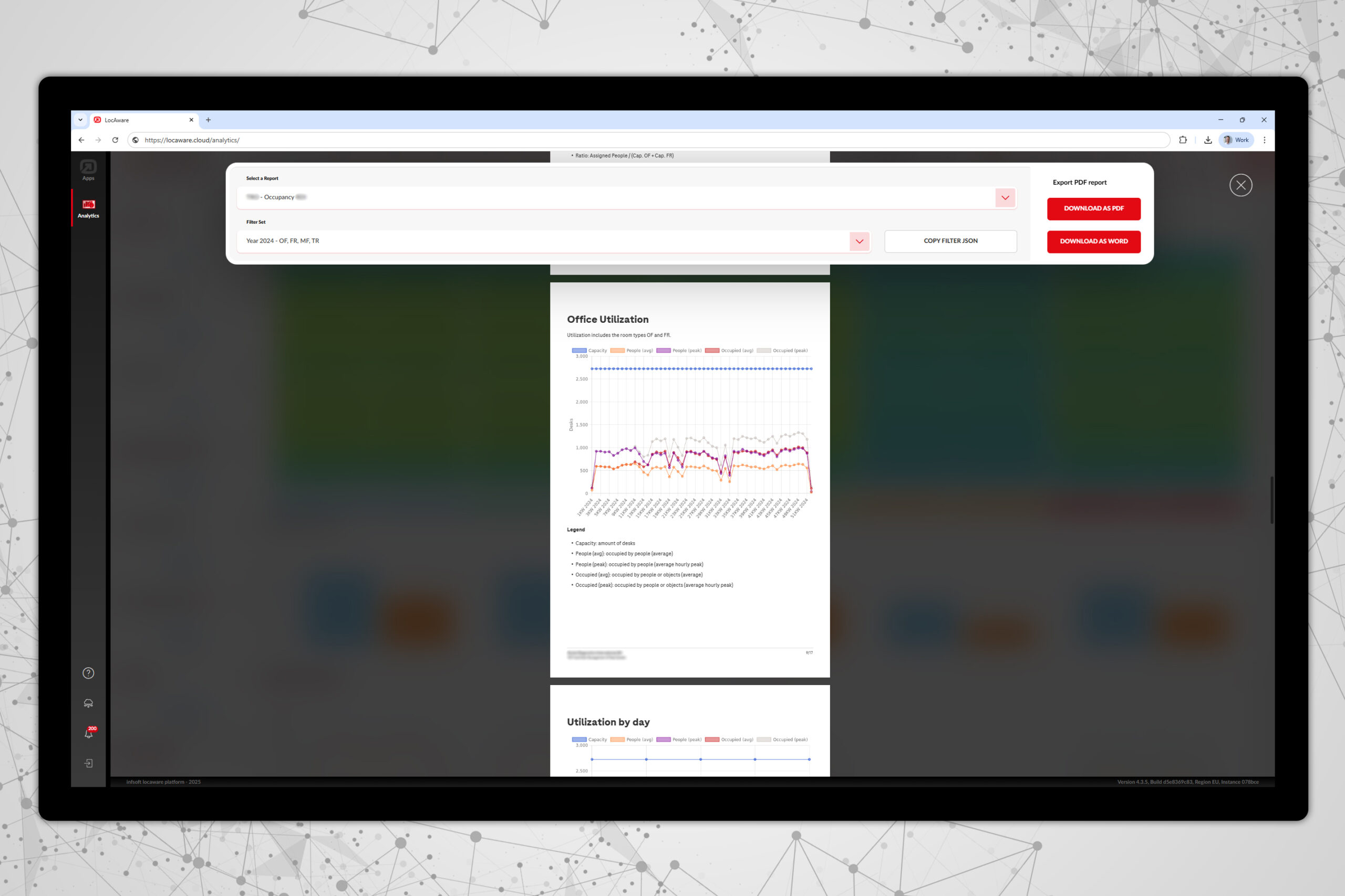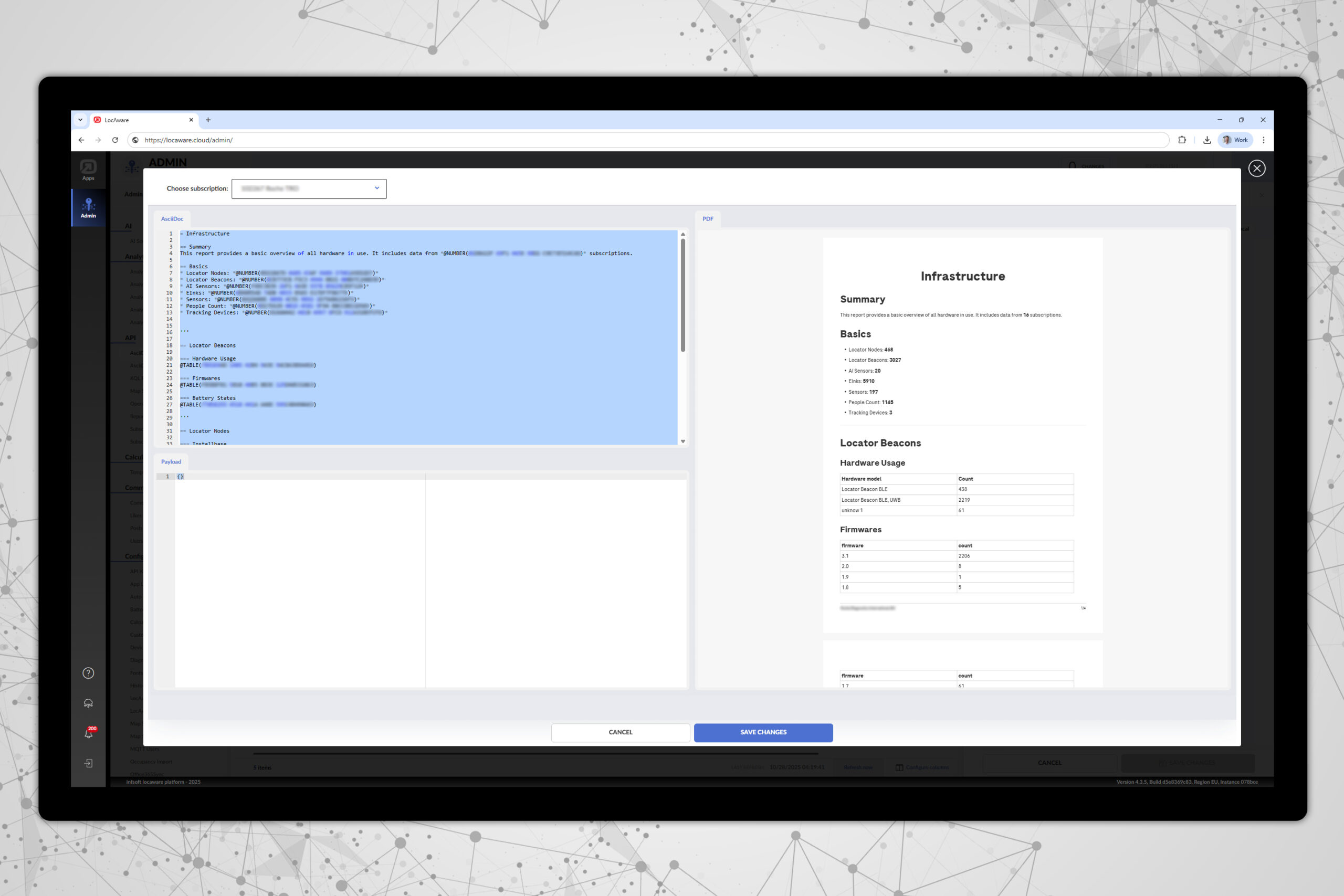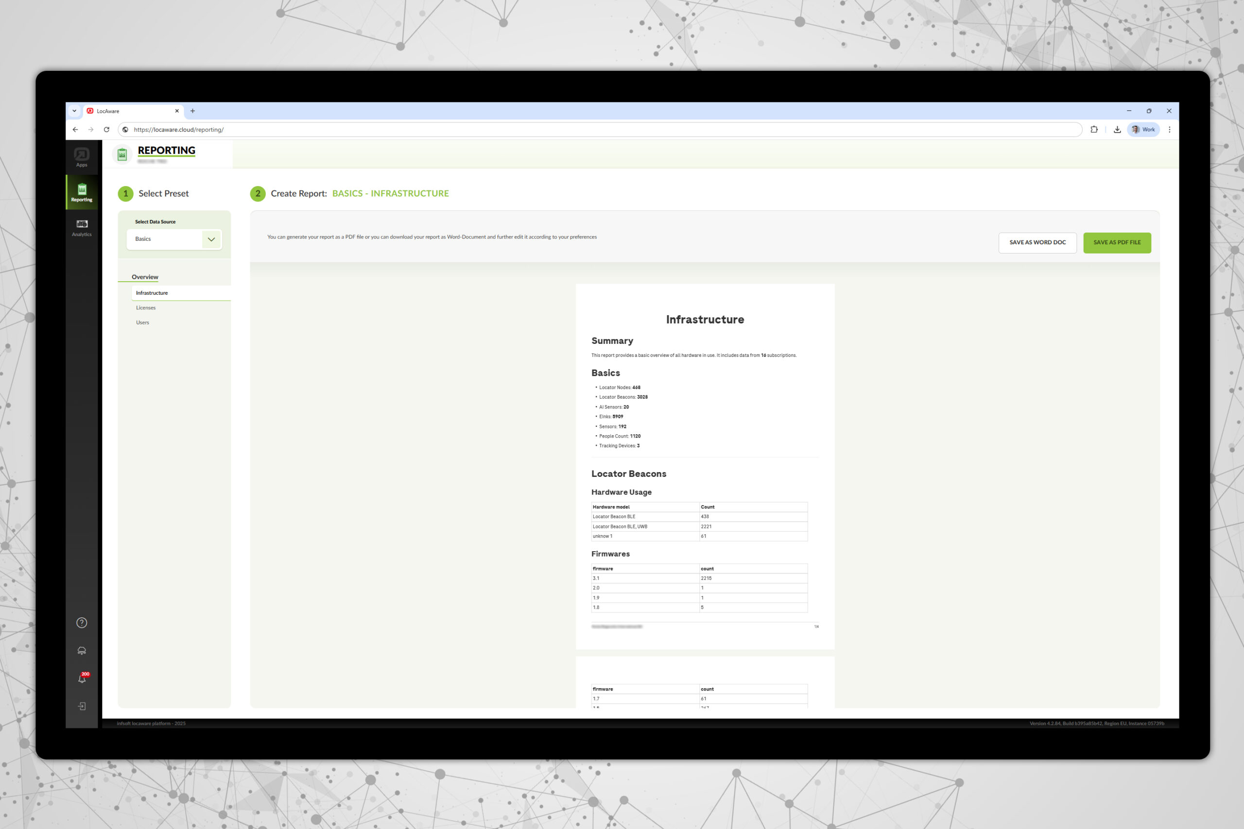 infsoft Reporting bündelt Informationen aus sämtlichen Tools der infsoft LocAware platform® – darunter Hardwaresysteme über das infsoft Hardware Tool, Auslastungsdaten aus infsoft Analytics sowie Wartungsstatistiken aus infsoft Maintenance.