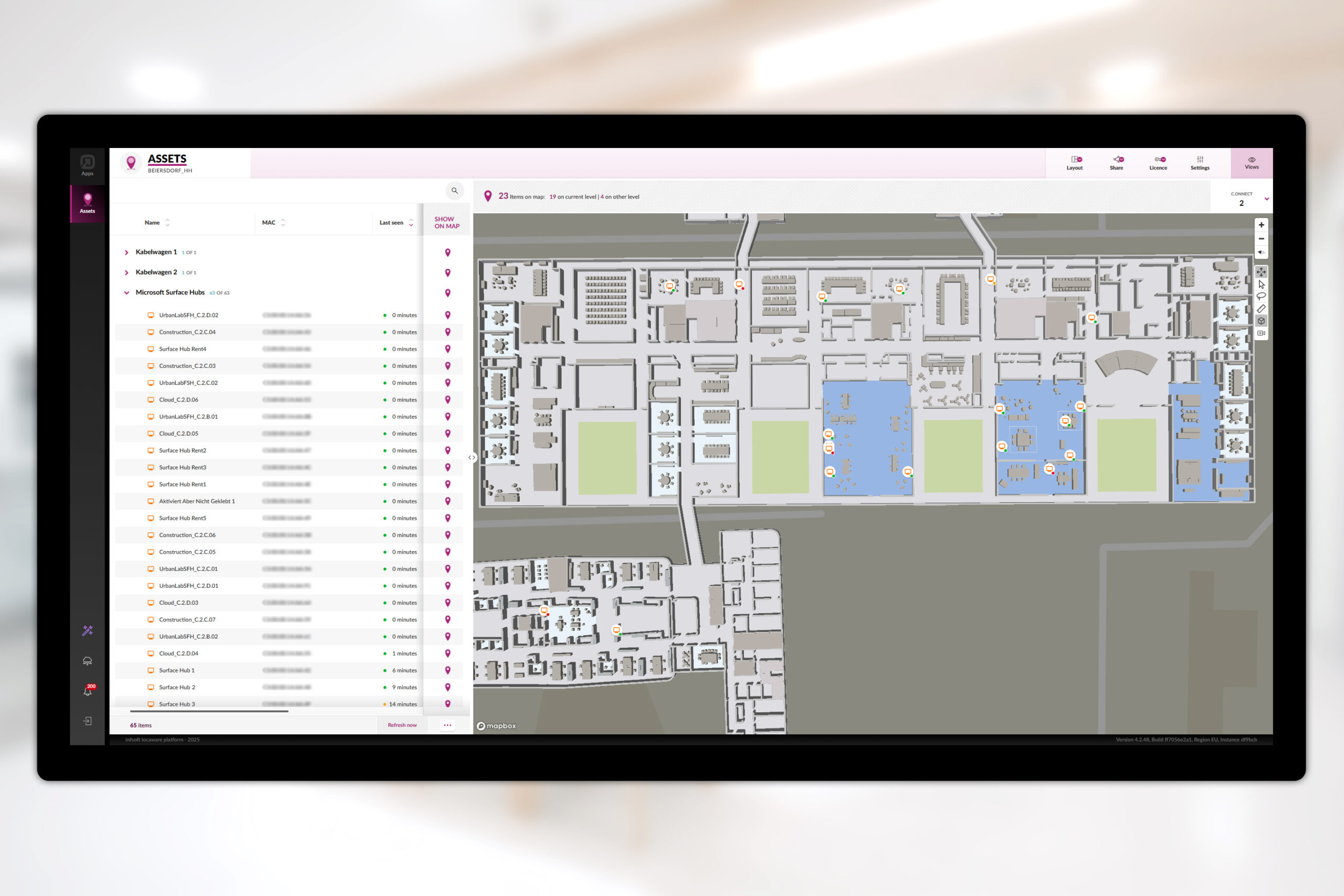 Über die Workspaces App lassen sich wichtige Betriebsmittel und mobile Assets standortgenau orten. Besonders relevant ist dies für gemeinsam genutzte technische Geräte wie Surface Hubs, Präsentationstechnik oder Leih-Equipment. Die Lösung schafft Transparenz, reduziert Suchaufwände und stellt sicher, dass Ressourcen effizient genutzt werden können.