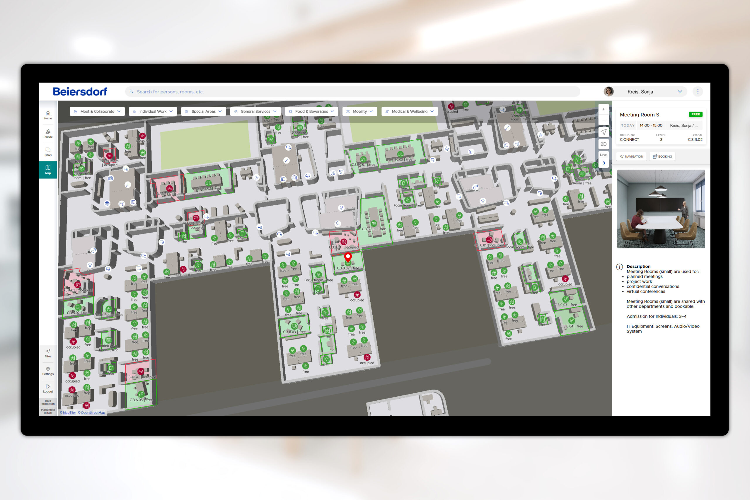 Eine dynamische, kartengestützte Darstellung des Campus zeigt relevante Punkte in Echtzeit: verfügbare Arbeitsplätze, freie Phone Booths, Lage von Meetingräumen, Aufenthaltsbereiche, Services u. v. m. Die Statusinformationen werden im Ampelprinzip direkt in der Karte dargestellt.