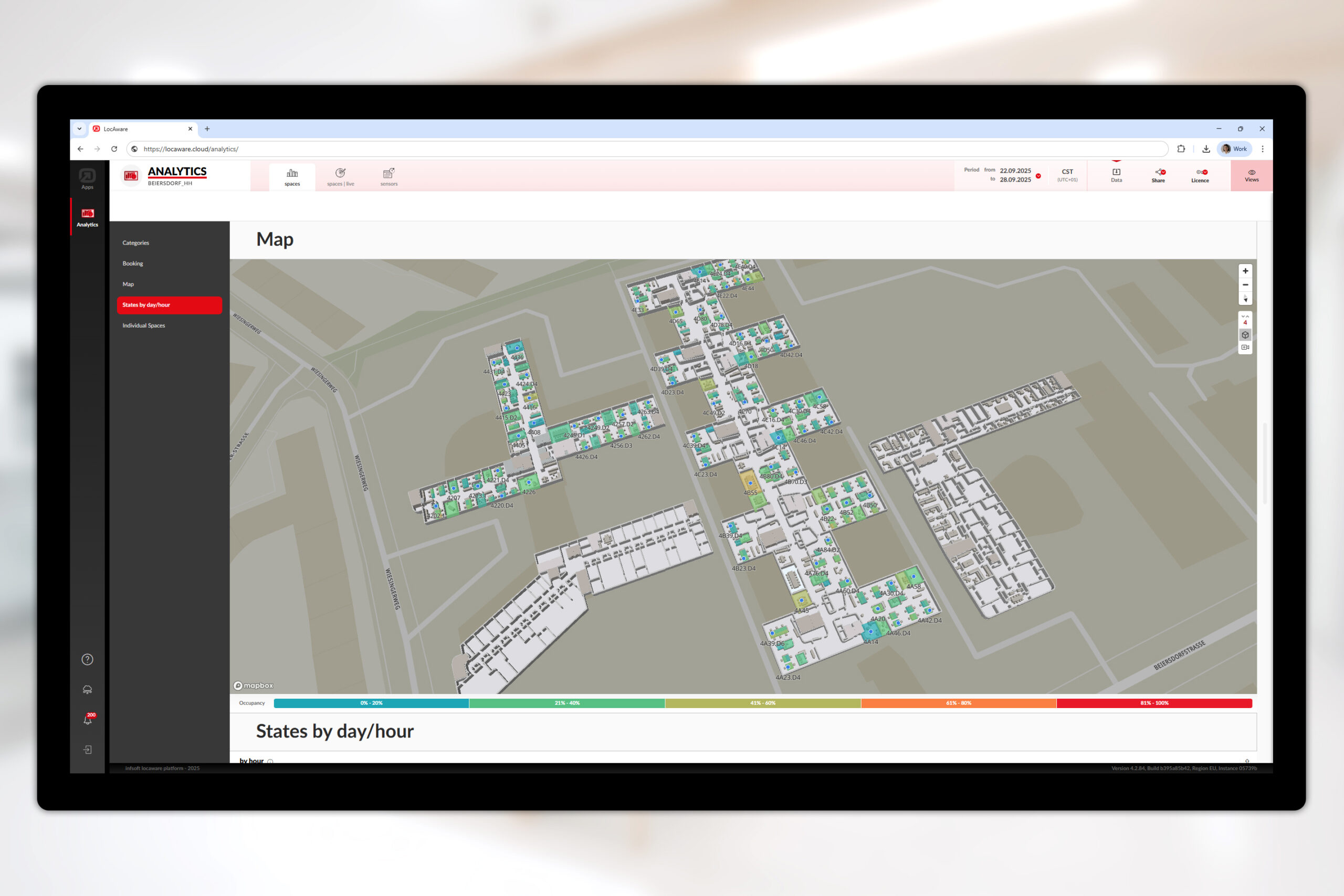 Mittels intelligenter Sensorik und Echtzeitanalyse werden die Campusflächen effizient gesteuert und langfristig optimiert. Die infsoft LocAware platform® liefert hierzu detaillierte Auswertungen zur Arbeitsplatznutzung sowie zur Auslastung von Besprechungsräumen in Echtzeit und in frei wählbaren zurückliegenden Zeiträumen.