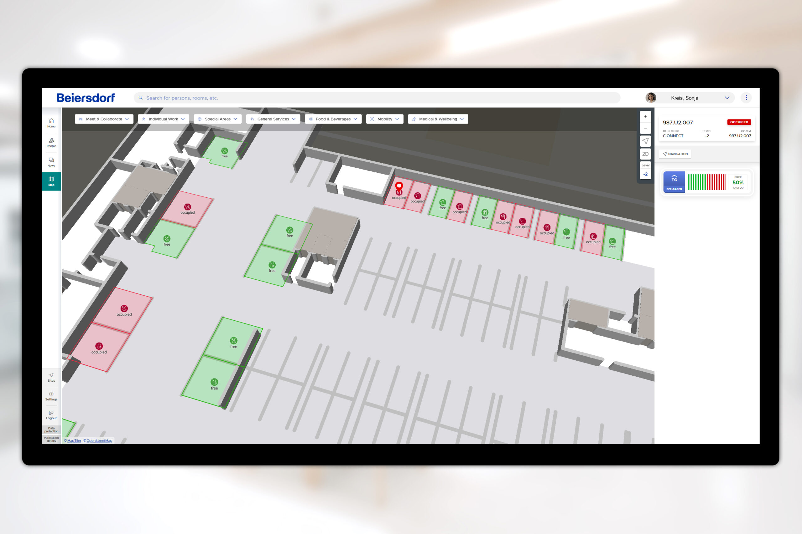 Mitarbeitende profitieren von einer verbesserten Orientierung, flexibler Arbeitsplatzwahl, smarter Flächennutzung sowie komfortablen Services wie Live-Parkplatzanzeigen, Colleague Finder oder Buchungsfunktionen für Räume, Schließfächer und mehr. Gleichzeitig liefern präzise Belegungsdaten und Bewegungsmuster wertvolle Insights für das Flächenmanagement – ein wichtiger Beitrag zur kontinuierlichen Optimierung der Arbeitsumgebung.