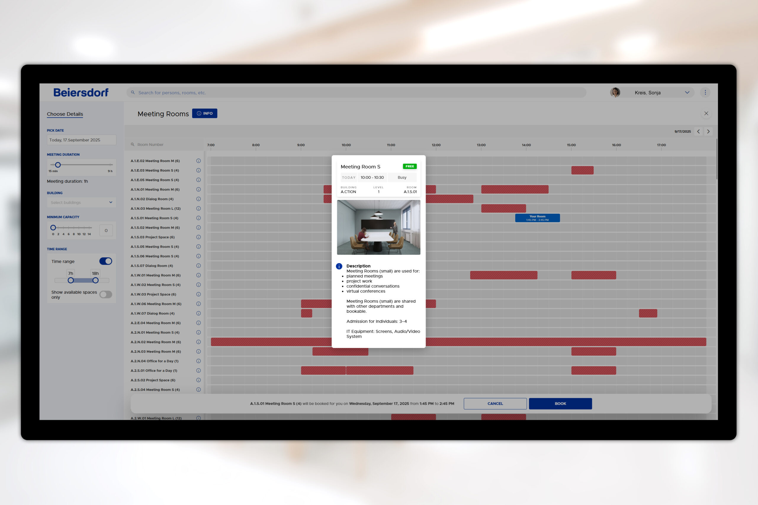 So entsteht ein detailliertes Bild der tatsächlichen Flächennutzung. Das ermöglicht die Umsetzung von Activity Based Working-Konzepten, eine gezielte Flächenoptimierung sowie bedarfsgerechte Reinigung. Mit Auto-Release-Funktionen können ungenutzte Räume automatisch wieder freigegeben – Ressourcen stehen so optimiert zur Verfügung.