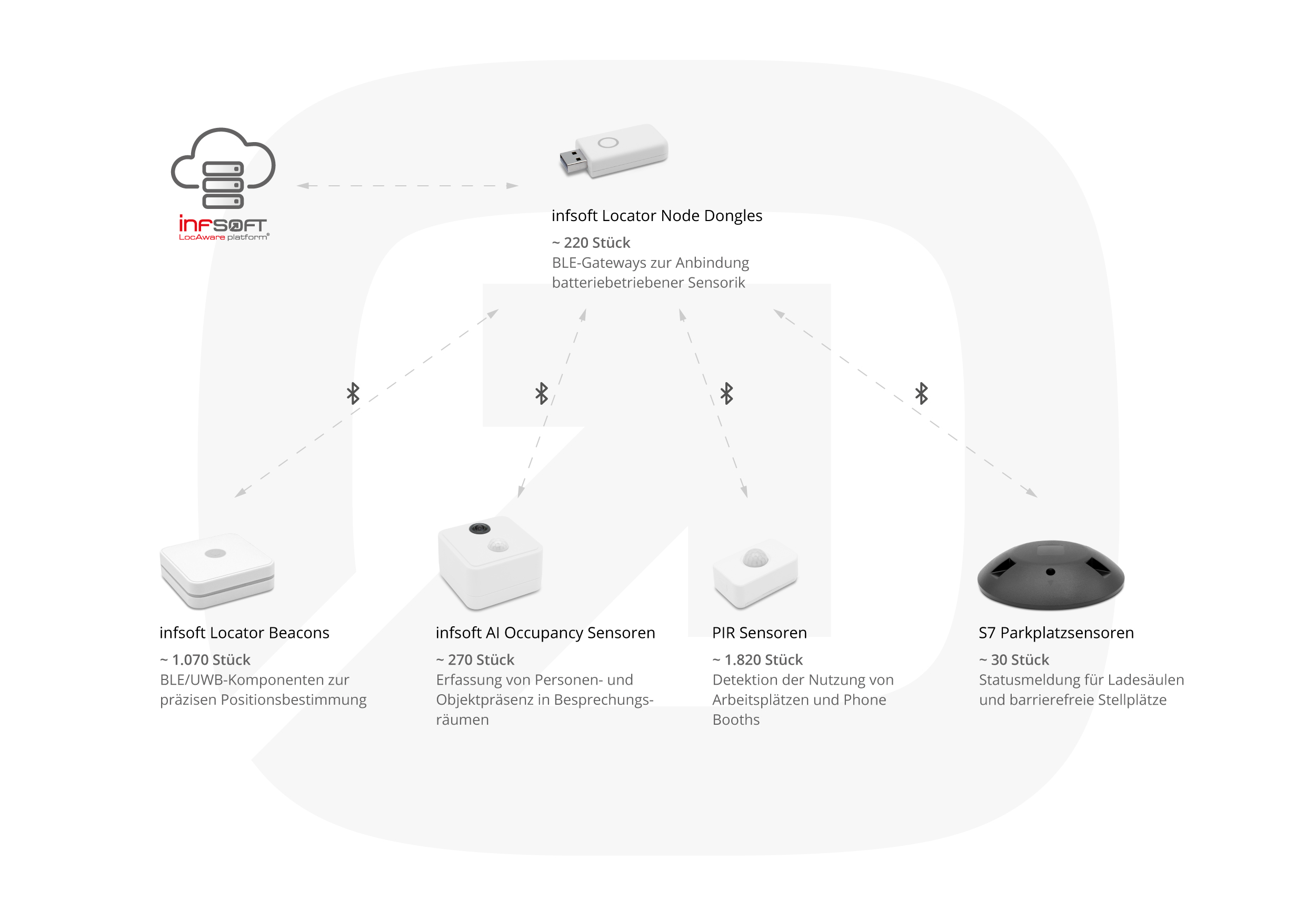 Um eine intelligente, vernetzte Umgebung zu schaffen, wurde auf dem Hamburger Campus eine umfassende IoT-Infrastruktur implementiert. Sie bildet das technologische Rückgrat für alle smarten Funktionen und Services auf dem Gelände. Die eingesetzte Sensorik und Ortungstechnologie ist vollständig in die infsoft LocAware platform® integriert und ermöglicht eine durchgängige Erfassung, Auswertung und Visualisierung raumbezogener Daten in Echtzeit.
