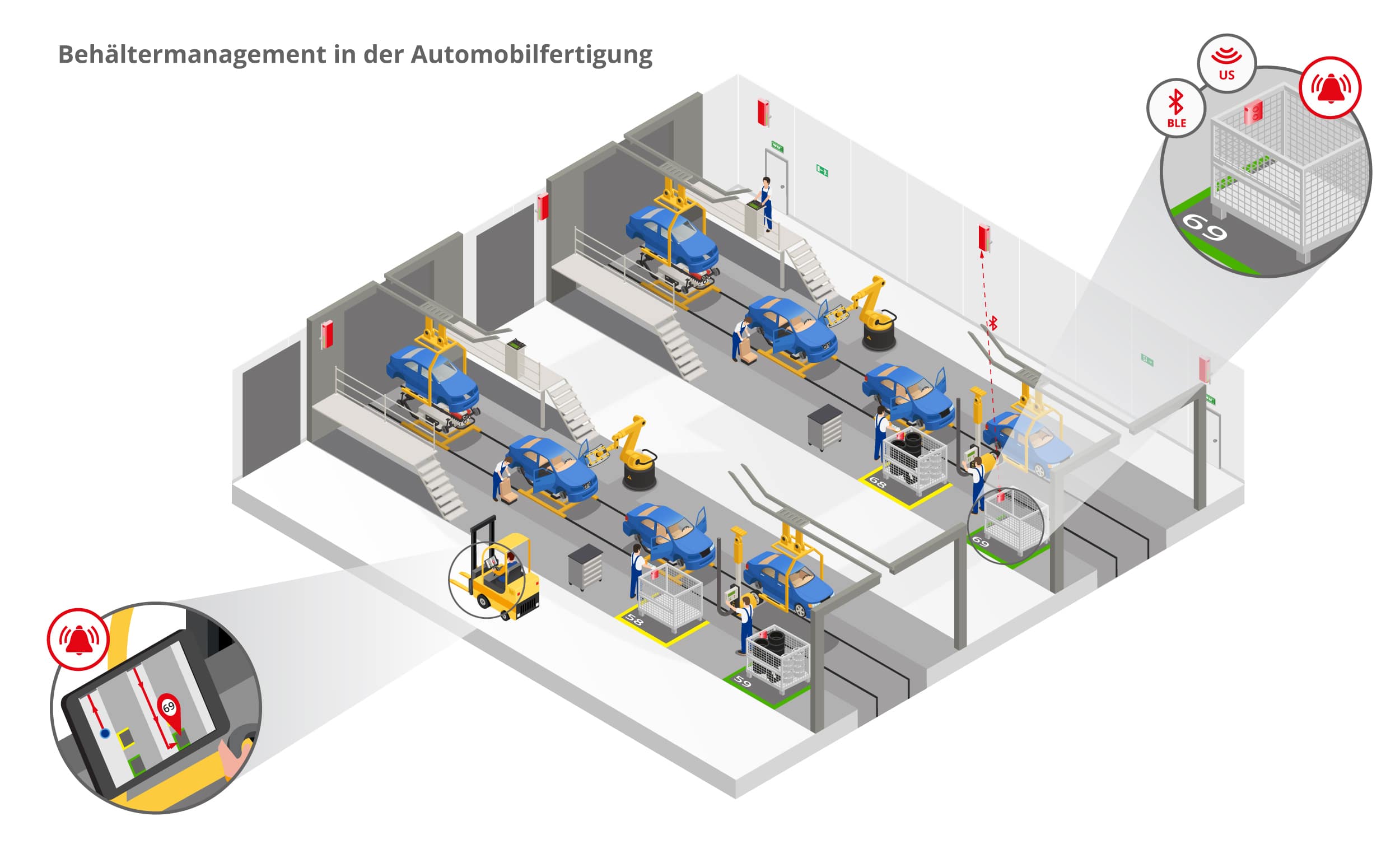 Mithilfe von Behältermanagement wird ein durchweg automatisierter Warenfluss realisiert und die taktgesteuerte Belieferung von Produktionslinien effizienter und wirtschaftlicher gestaltet. Die Tracking Lösung bildet die Behälterbewegungen vollautomatisiert ab – der Standort der Behälter kann via Bluetooth Low Energy (BLE) Tracking von der Beladung des Routenzugs über die Fahrt zu den einzelnen Stationen an der Produktionslinie bis hin zur Entladestation lückenlos verfolgt werden. Hierdurch wird gewährleistet, dass die richtigen Produkte zur richtigen Zeit an den richtigen Ort transportiert werden.