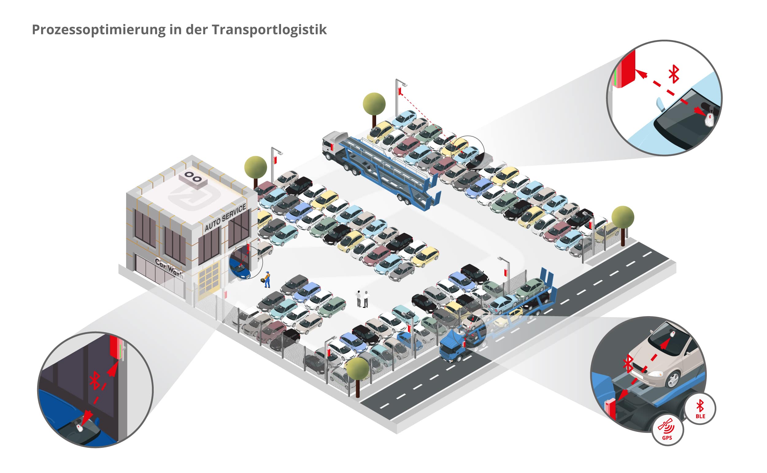 Eine Tracking Lösung liefert präzise Positionsdaten von Neuwagen. Hierdurch wird jederzeit eine zentrale Übersicht der Standorte sämtlicher Fahrzeuge ermöglicht. Die Tracking Lösung funktioniert sowohl im Innen- als auch im Außenbereich und gewährleistet einen sicheren und effizienten Betrieb und trägt zur bestmöglichen Prozessoptimierung bei. Es kann jederzeit überprüft werden, ob sich die Fahrzeuge noch im Zeitplan befinden und bei zu erwartenden Verspätungen können rechtzeitig Gegenmaßnahmen eingeleitet werden.