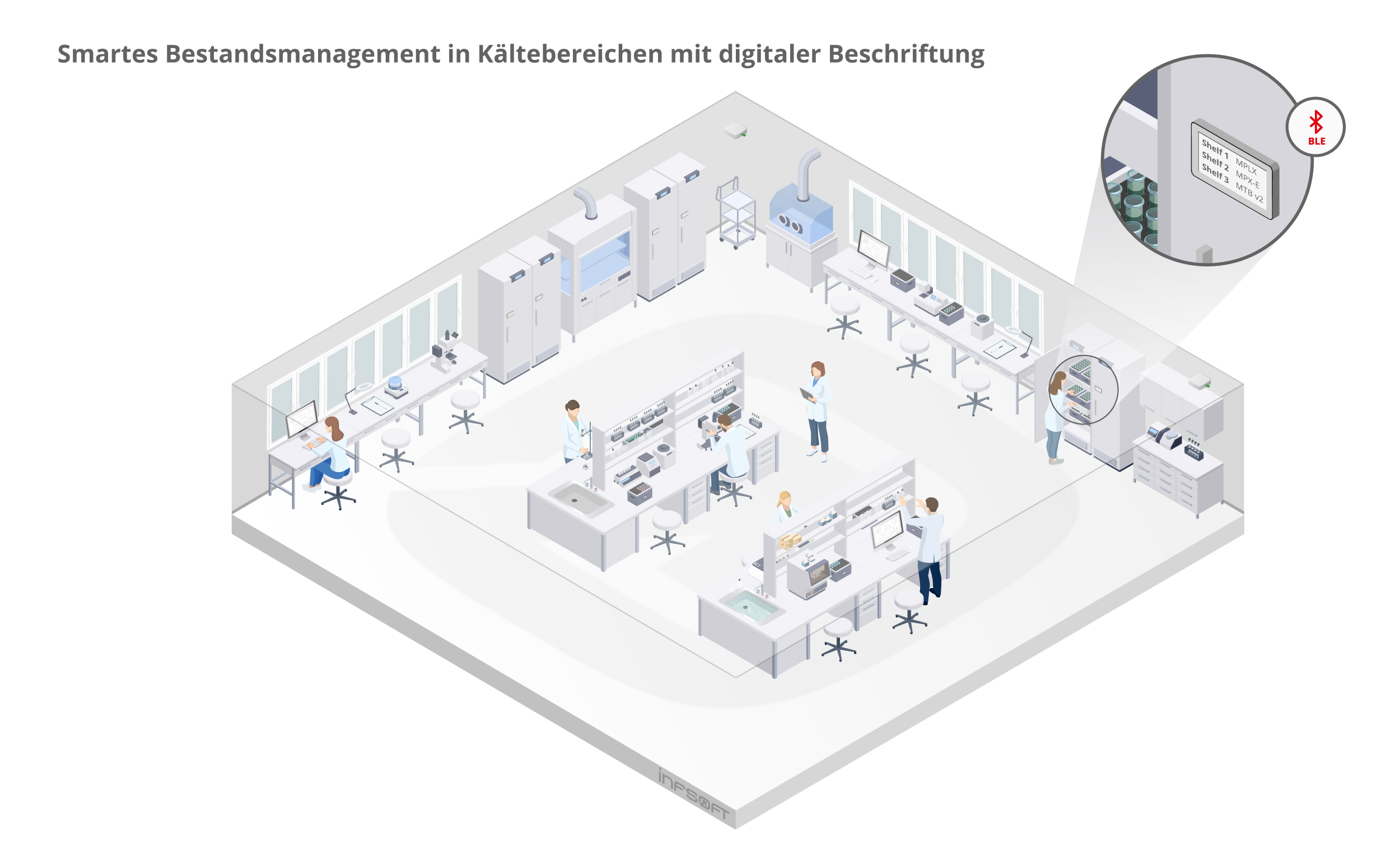 Mit digitaler Beschriftung lässt sich die Verfügbarkeit von Gefrierschrankfächern und begehbaren Kühlgeräten in Echtzeit visualisieren. Jedes Fach wird übersichtlich dargestellt, inklusive der zugeordneten Proben und Projekte, des aktuellen Gerätestatus sowie der verantwortlichen Mitarbeitenden für Bestände und Geräte. Die BLE-Technologie ermöglicht eine nahtlose Integration in bestehende Laborinformations- und Verwaltungssysteme, während energieeffiziente E-Ink Displays eine wartungsarme, gut ablesbare Lösung direkt am Gerät bieten. Auf diese Weise wird die Nutzung der Kühlkapazitäten optimiert, Arbeitsabläufe werden effizienter gestaltet, die Öffnungszeiten der Kühlgeräte minimiert und Temperaturschwankungen reduziert. Gleichzeitig steigt die Transparenz im Labor, wodurch Fehlerquoten bei der Probenlagerung deutlich gesenkt werden.