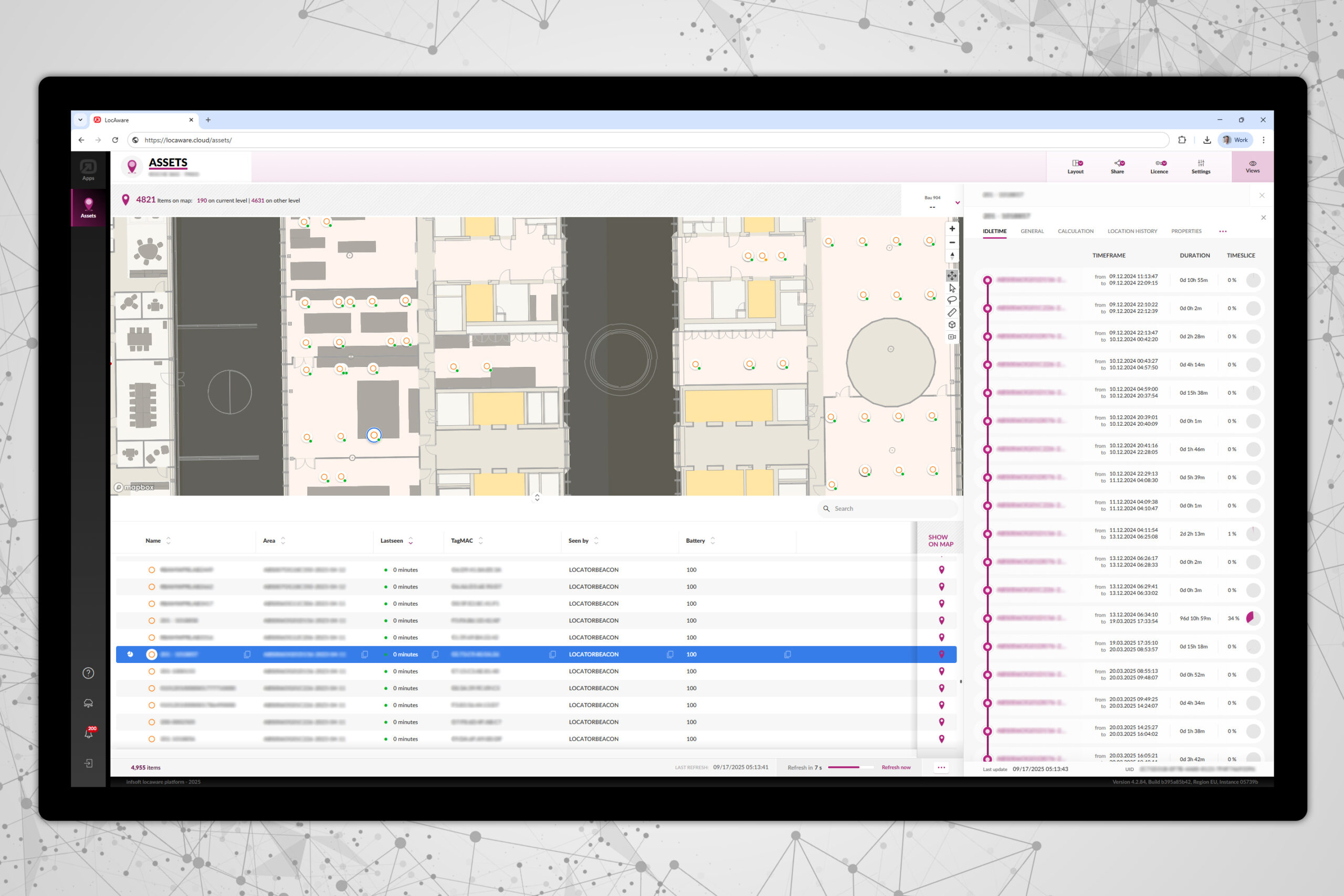 All registered assets are displayed on an interactive map and can be viewed individually or in groups. With the integration of infsoft Locator Nodes, precise real-time positioning is ensured.