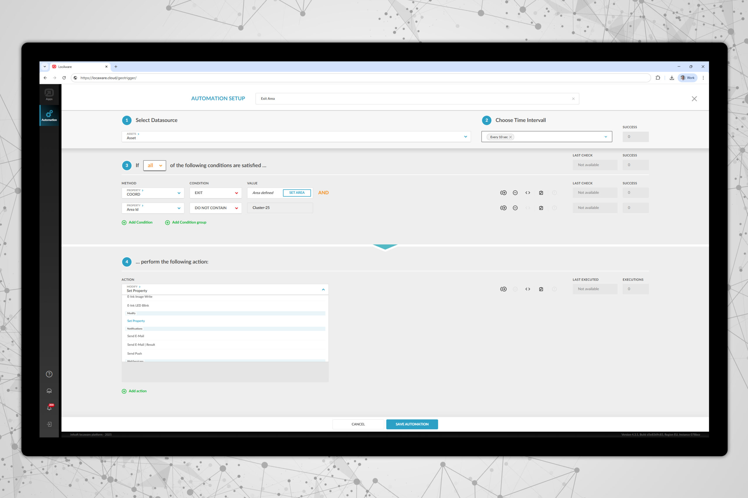 Integration with the infsoft Automation Engine enables automatic workflow triggers – for example, when an asset moves outside defined zones or reaches a specific condition.