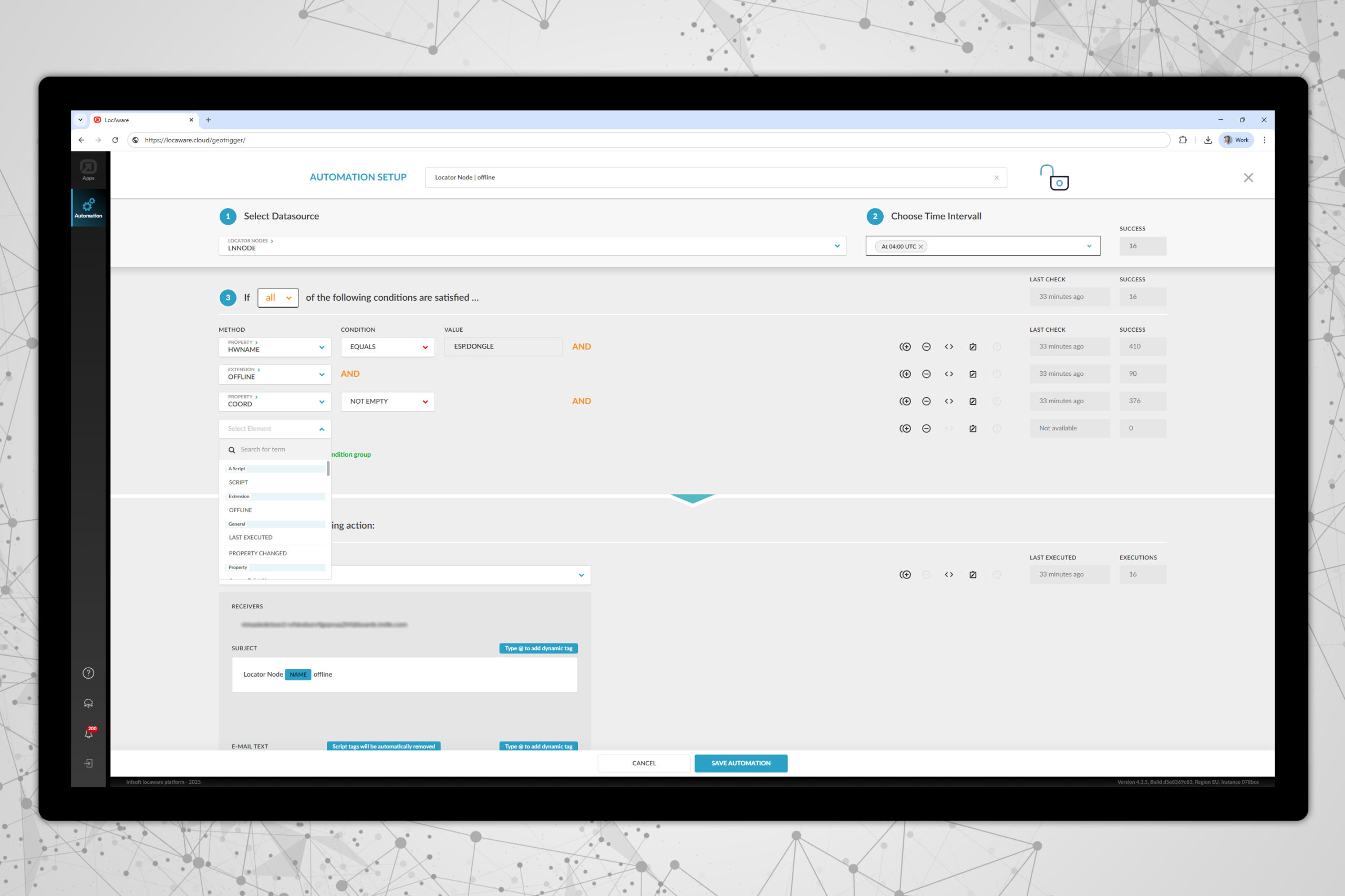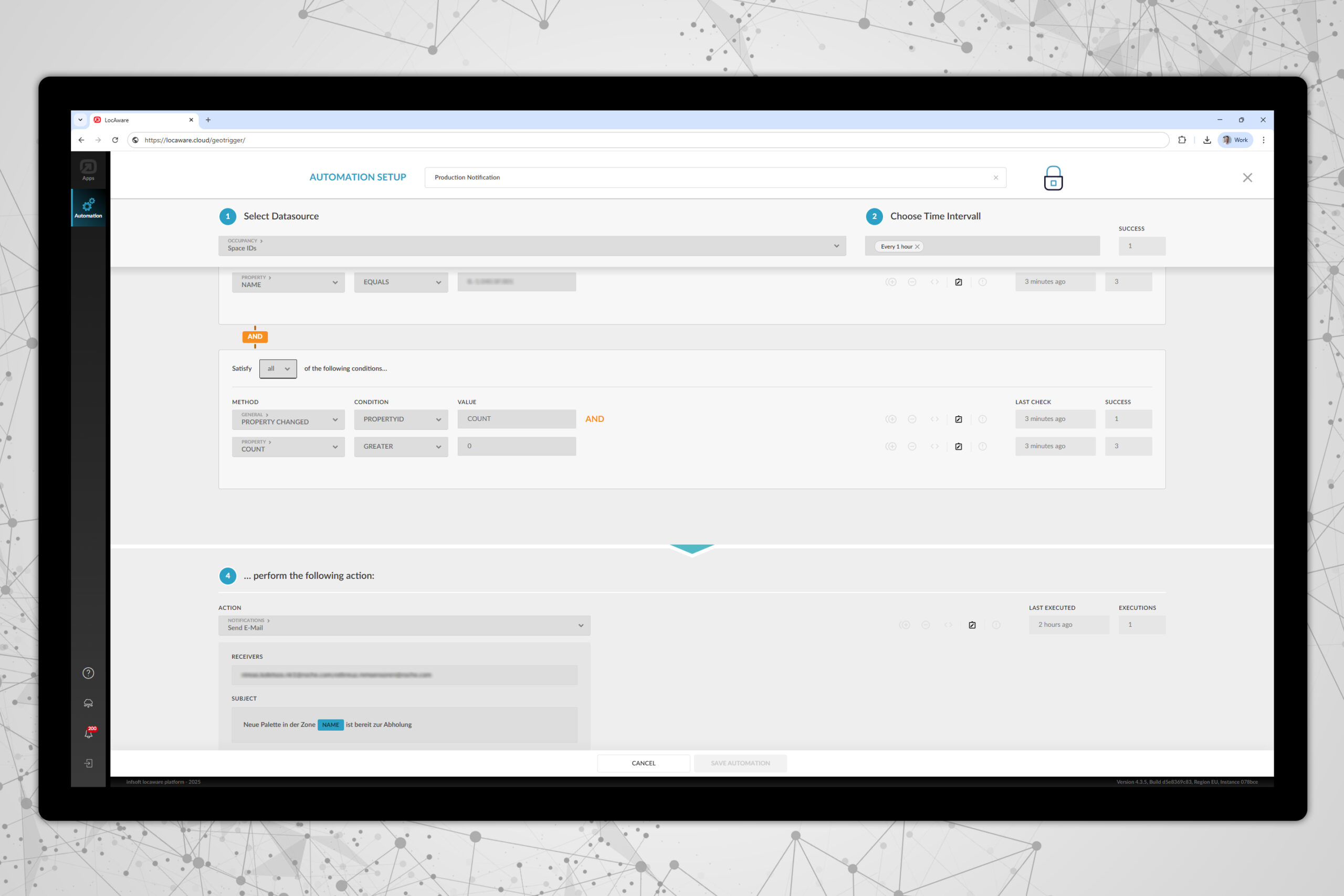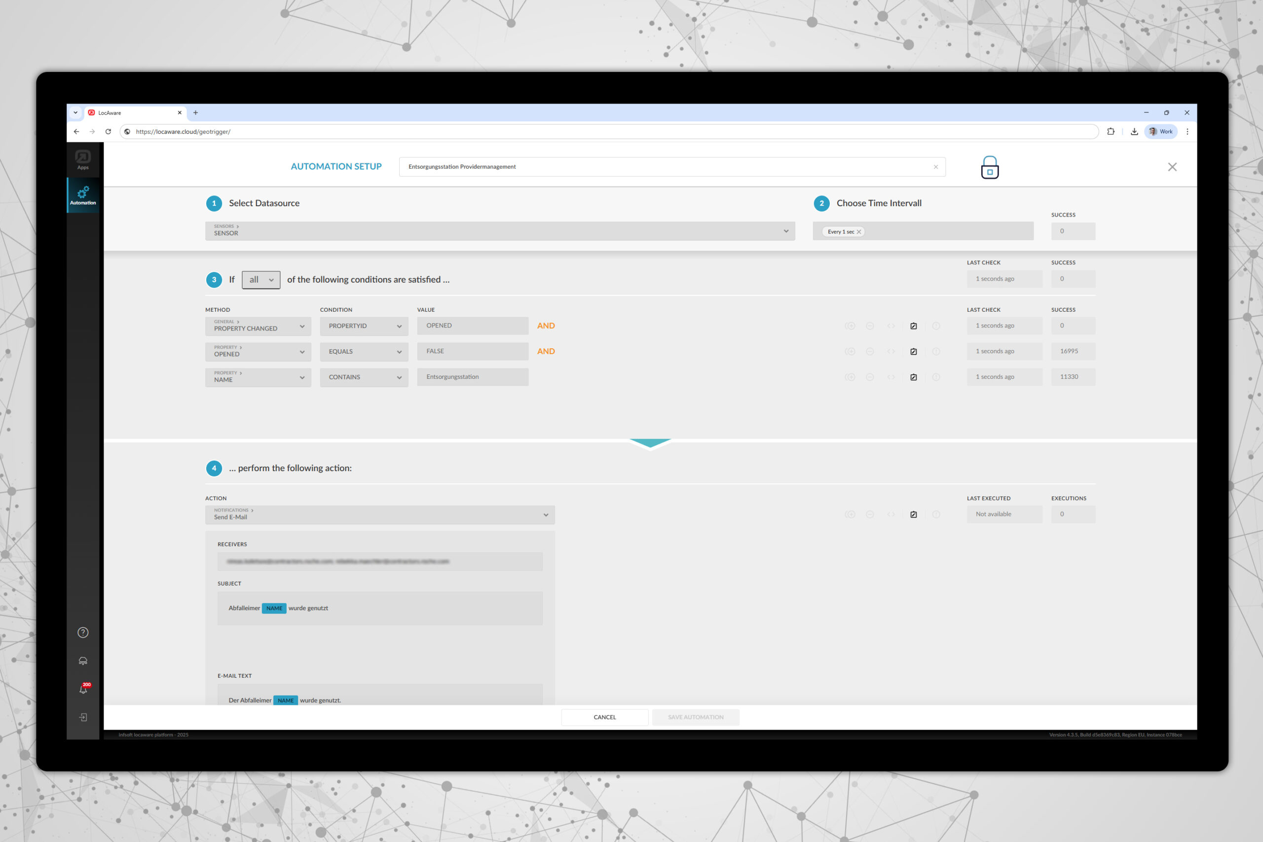 With infsoft Automation, automated processes can be defined and controlled. The tool enables notifications and actions to be triggered based on predefined events, conditions, or movement patterns – in real time and fully data-driven. A wide range of use cases can be realized, from system monitoring and asset tracking to smart building automation.