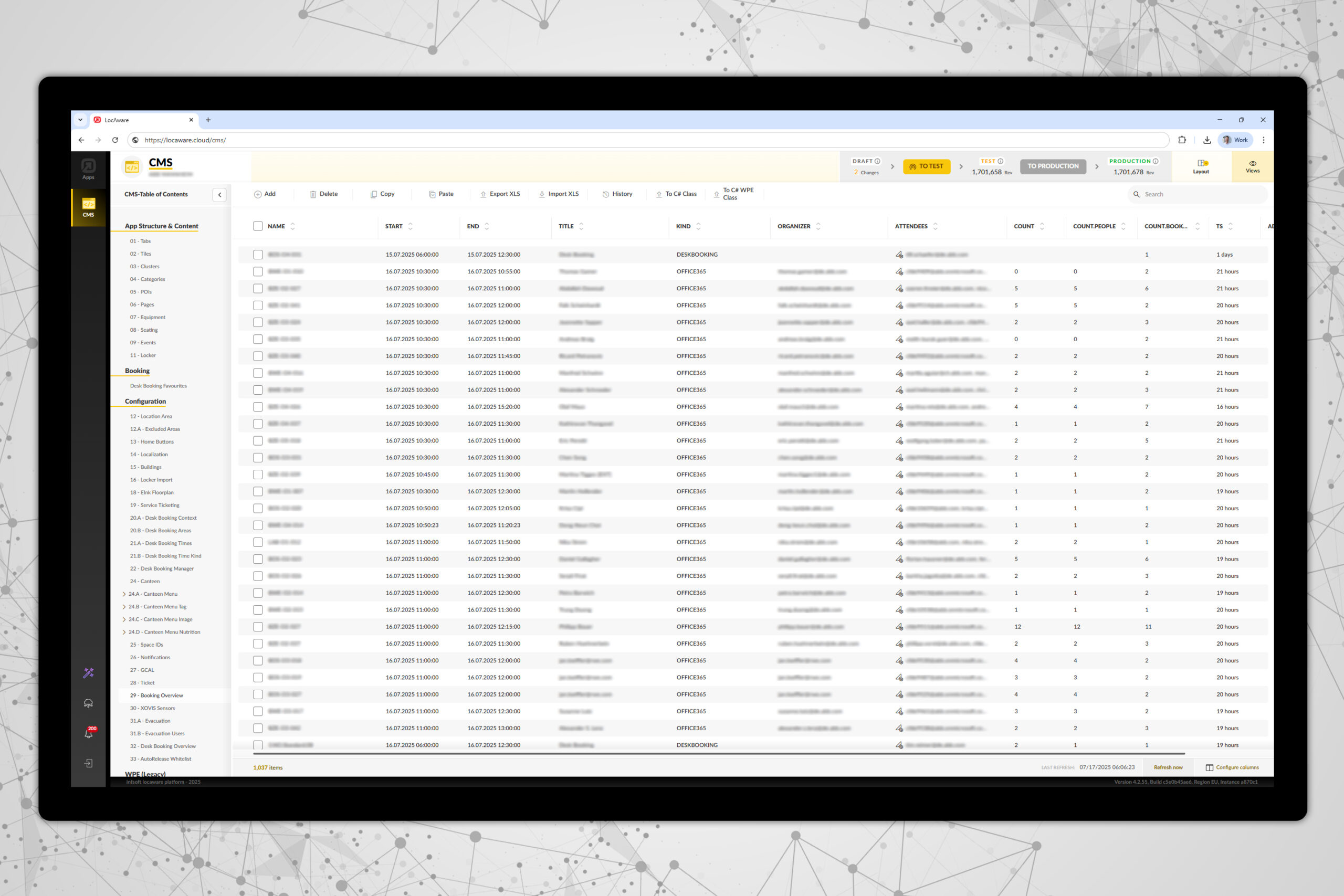 The tool enables authorized users to intuitively adjust content in real time. This includes Points of Interest (POIs) as well as menu-based items such as events, news, room and workspace information, and booking configurations. Visual elements within the app can also be customized through the CMS.