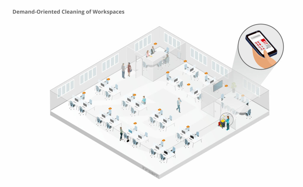 Regular cleaning and disinfection of workplaces is more important than ever. In this context, demand-oriented cleaning is preferable to periodic cleaning for several reasons. On the one hand, the available resources can be focused on the relevant cleaning tasks, and on the other hand, it can be ensured that recently used rooms and workspaces are disinfected before being used by a different person.
